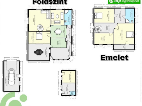 A telken több melléképület is rendelkezésre áll: egy nagy alapterületű, elektromos kapuval működő garázs, amely méretéből adódóan műhely kialakítására is alkalmas; egy könnyűszerkezetes tároló; egy külön nyárikonyha; valamint egy önálló, WC-vel ellátott "dühöngő" helyiség, amely hobbiszobaként vagy vendégtérként is funkcionálhat.