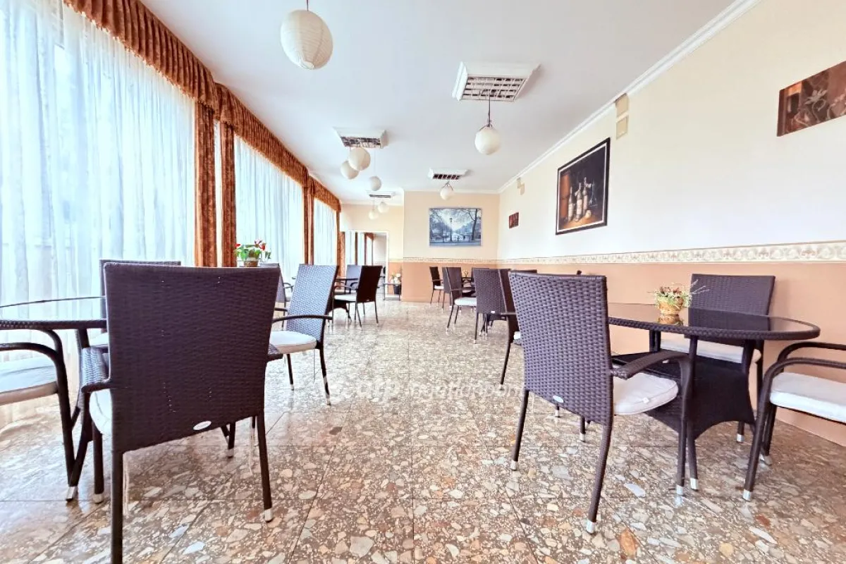 Eladásra kínálunk Vas vármegyében, Celldömölk központi részén egy 1986-ban épült, 54 szobás, akár 150 fő egyidejű ellátására alkalmas, kiváló műszaki állapotú és teljes körűen korszerűsített épületet. Az ingatlan egy 7014 m2-es, frekventált elhelyezkedésű telken fekszik, a város egyik legkedveltebb és legjobban megközelíthető pontján. A szálláshely a műszaki tartalmát, méretét és adottságait tekintve jóval magasabb piaci értéket képvisel, azonban jelen hirdetés keretében alkalmi áron kerül értékesítésre, ami kiemelkedő lehetőséget kínál befektetők és fejlesztők számára egyaránt. A hotel az építésétől kezdve a mai napig folyamatos karbantartás és fejlesztés alatt állt, ennek köszönhetően rendkívül jó statikai, energetikai és esztétikai állapotban kerül új tulajdonosa kezébe. Az épület professzionális UNIVÁZ szerkezetre épült, amely a moduláris kialakításból adódóan kimagasló szerkezeti stabilitást, kiemelkedő teherbírást és páratlan téralakítási rugalmasságot biztosít. Ez lehetővé teszi, hogy az épület belső terei a jövőbeli igényekhez igazodva könnyedén átszervezhetők vagy bővíthetők legyenek, ami jelentős értéknövelő tényező mind szállodai, mind intézményi fejlesztés esetén. A rendszer előnyeihez hozzátartozik a kiváló hang- és rezgéscsillapítás is, amely magas szintű vendégkomfortot eredményez, miközben időtálló, masszív szerkezete hosszú távon is biztonságos, megbízható működést garantál. A korszerűsítés során az energetikai rendszer teljes körű megújítást kapott: modern, nagy teljesítményű Riello kazánokkal, új puffertartályokkal, komplett csőhálózattal, indirekt tárolókkal és szabályozható radiátorokkal lett felszerelve az épület. A teljes homlokzat 15 cm-es hőszigetelést, a záró födémrészek 40 cm-es szigetelést kaptak, a tető pedig korszerű, napelemtelepítésre optimalizált Sika PVC szigeteléssel lett ellátva. A fenntartható működést egy 27 kW teljesítményű napelemrendszer támogatja, amely jelentősen csökkenti az éves energiaköltséget. A hotel teljes villamos hálózata nagy kapacitású, korszerű rendszerrel működik, 3×80 amper rendelkezésre állással, amely bármilyen jövőbeli bővítéshez, konyhatechnológiához vagy wellnessfejlesztéshez megfelelő műszaki tartalékot biztosít. A tágas, rendezett telek füvesített, murvázott és 1200 m2-en térburkolt felületekkel rendelkezik, valamint két autós és egy személyi bejáraton keresztül közelíthető meg. A főépület mellett egy 160 m2-es, kívülről felújított melléképület található, amely jelenleg raktárként működik, de korábban konyhai egységként üzemelt, így további fejlesztési lehetőségeket rejt magában. Az ingatlan előtt, a főúton autóbusz megálló van kialakítva a távolsági és helyi járatok biztonságos megállására. A 7014 m2-es telek rendezett, füvesített, murvázott és 1200 m2-en térburkolt felületekkel rendelkezik, két autós bejárattal és kiváló parkolási lehetőségekkel. A szállodával együtt eladó egy 160 m2-es, kívülről felújított melléképület is, amely korábban konyhai kiszolgáló egységként működött, jelenleg raktárként üzemel, de funkcionálisan szabadon tovább fejleszthető. A hotel körül teljes hosszában gondozott járda húzódik, az épület mindkét oldalról gépjárművel is megközelíthető. Helyiségek kialakítása: A földszinten recepció, aula, éttermi és büférész, több raktárhelyiség, személyzeti vizesblokkok, közösségi mellékhelyiségek, konyha, 10 vendégszoba és 50 nm-es társalgó is található. Az első emeleten 14 szoba, 6 kétszobás apartman, közösségi terek, teakonyha, konferenciaterem és további vizesblokkok kerültek kialakításra. A második emelet 9 apartmanból (összesen 18 szoba), egy újabb konferenciateremből, teakonyhából és kiszolgáló helyiségekből áll. A tetőtérben a kazánház és több tároló kapott helyet. Elhelyezkedésének, méretének, kialakításának és kiváló műszaki paramétereinek köszönhetően az ingatlan ideális választás lehet nemcsak hotelként, hanem magánkórház, rehabilitációs központ, idősek otthona, oktatási intézmény, kollégium vagy bármely nagy létszámot kiszolgáló intézmény létrehozására is. A szálloda rendelkezik egy komplett, felmérési tervdokumentációval, és egy idősek otthonára kidolgozott hivatalos alaprajz szintű tervdokumentációval, amely értékes támogatást nyújt egy ilyen profilú fejlesztéshez. Ez az épület nem csupán egy szálloda, hanem egy sokoldalúan hasznosítható, magas műszaki színvonalú, jövőálló ingatlanbefektetés, amely hosszú távon is stabil és kiemelkedően értékálló lehetőséget kínál új tulajdonosának. A szálláshely Celldömölk egyik legkedvezőbb elhelyezkedésű ingatlana, hiszen a város központja és a Vulkán Gyógy- és Élményfürdő között található, mindkettőtől kényelmes sétatávolságra. A környék különösen vonzó az egészségturizmus iránt érdeklődők számára, mivel a fürdő gyógyvizes medencéi, wellness szolgáltatásai és élményelemei egész évben látogatottak. A közelben helyezkedik el a Ság-hegy, amely különleges geológiai kialakulásával, túraútvonalaival, tanösvényeivel és kiemelkedő panorámájával, borútjaival a térség egyik legnépszerűbb kirándulóhelye. Rövid távolságra található a Kemenes Vulkán Park is, amely interaktív kiállításaival és oktatási programjaival széles körben vonzza a turistákat és csoportokat. A városban több sportcsarnok, sportpálya, füves és műfüves áll rendelkezésre. A Mária út /gyalogos, kerékpáros/ Celldömölkön halad át. A mindennapi ellátást több közeli étterem, kávézó és üzlet bizt